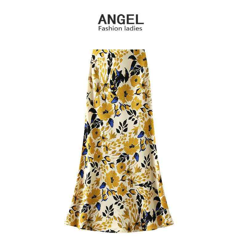 スカート ウエストゴム レトロ 花柄 総柄 ドレープ感 マーメイドスカート ミモレ丈 ポリエステル リゾート きれいめ エレガント 夏 普段使い 通勤