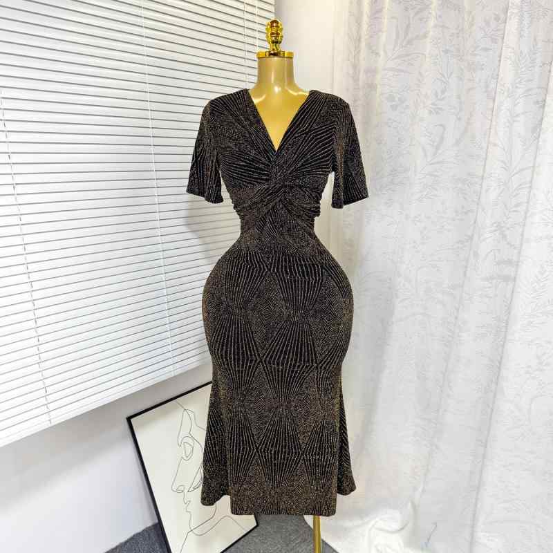 ・カテゴリ: ワンピース・スタイル: エレガント、プルオーバー・主な素材: ポリエステル95%以上・柄: ジルコニア柄・技法: ホットスタンピング・丈: ミディ丈・スカートタイプ: タイトスカート・ネックライン: Vネック・袖丈: 半袖・ウエスト: ハイウエスト・カラー展開: ブラック&シルバー、ブラック&ゴールド・サイズ: フリー