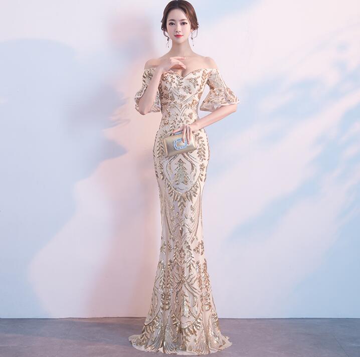 全4色 イブニングドレス 黒 オフショルダーマーメイドラインドレス レディース キラキラ Vネック マキシ丈 タイト プリンセス 演奏会 スパンコール キラキラドレス イブ..