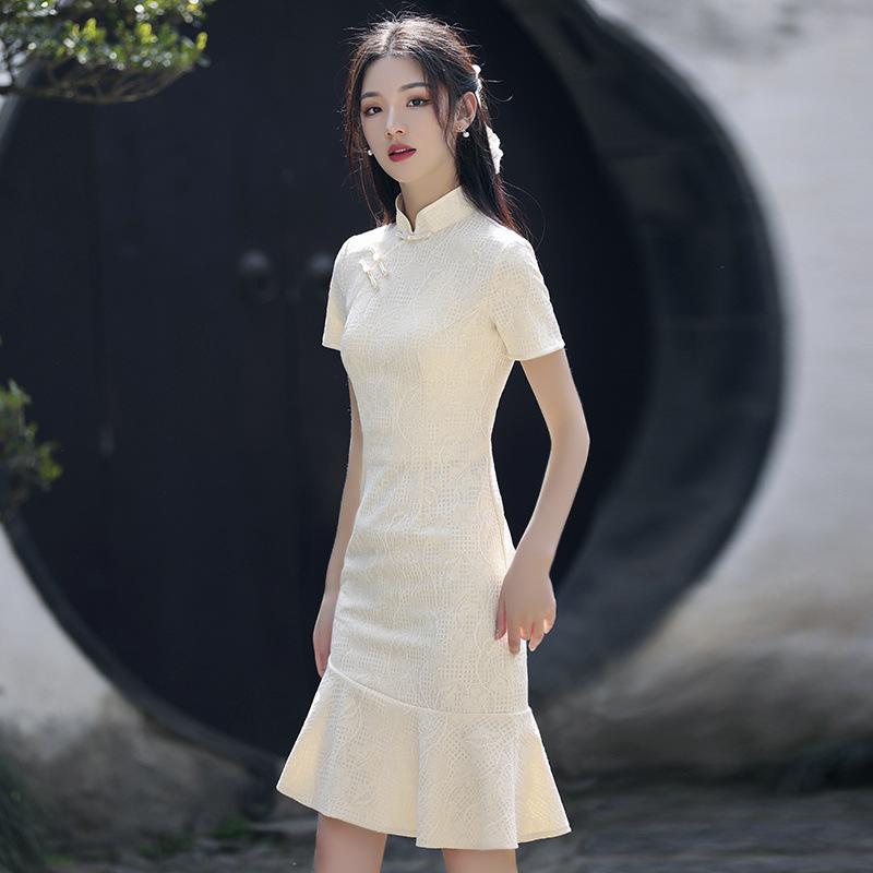 ワンピース レディース 改良チャイナドレス マーメイド ロング丈 小柄 スタイルアップ 体型カバー スリム見え ホルターネック フリルスリーブ レース エレガント 上品 パ..