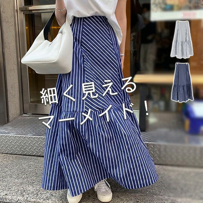 スカート マーメイドスカート ストライプ 春 夏 ロング丈 マーメイドシルエット レディース かわいい ウエストゴム 体型カバー おしゃれ ゆったり カジュアル ナチュラル..