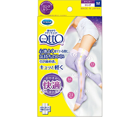 4906156600469 44540 *寝ながらメディキュットロングLサイズ 「寝ながらメディキュット ロング ラベンダー L」は、はくだけで脚をキュッとひきしめ軽くする着圧ソックスです。寝るときに適した低めの着圧値で効果的にひきしめ、翌朝の脚をすっきりさせます。ロングタイプなので、脚全体をじっくりケアします。足首は寝ている姿勢にあわせたフラット設計。つま先なしなので、お休み中の熱を発散します。幅広リブでずれにくく、寝返りを打っても安心です。また、コットンフィールの新素材により、着圧はそのままにやわらかな肌ざわりを実現しました。着用方法●着用前に指輪等をはずし、手足の爪をなめらかにしてください。●爪を立てたり、一気に引き上げないでください。●サポート力があるため、注意しながらゆっくり引き上げてください。(1)ソックスをたぐりよせて、つま先を入れます。(2)足首まで引き上げ、かかとの位置を合わせます。(3)編み分..