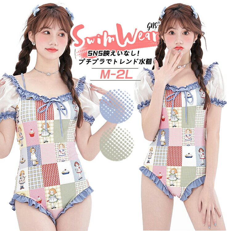 水着 レディース モノキニ マルチカラー 高校生 チェック 体型カバー バブルスリーブ 小胸 胸パッド付き ホルター 総柄 レース UVカット ブルー 華奢 水陸両用 速乾 露出..