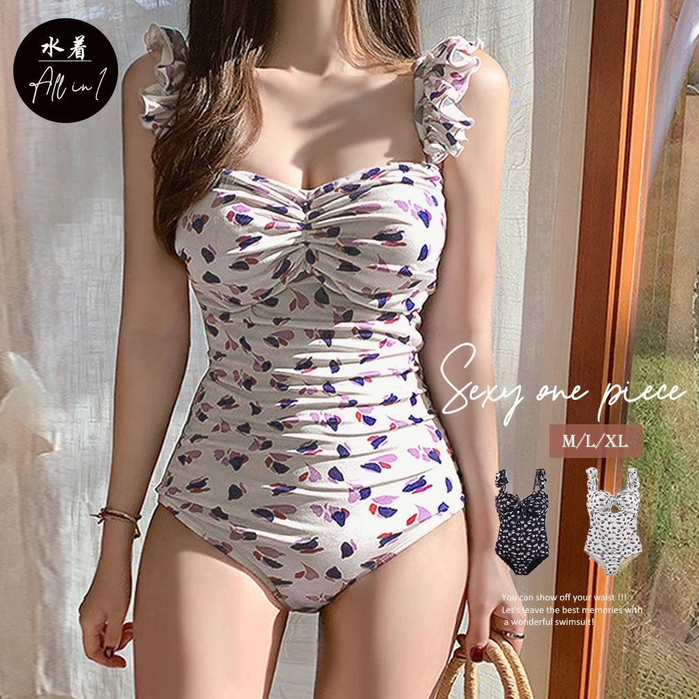 人気 肩出し 日焼け止め 夏服 セクシー 海 夏 20代 胸元ギャザー モノキニ 体型カバー 花柄 韓国風 フリルショルダー レディース
