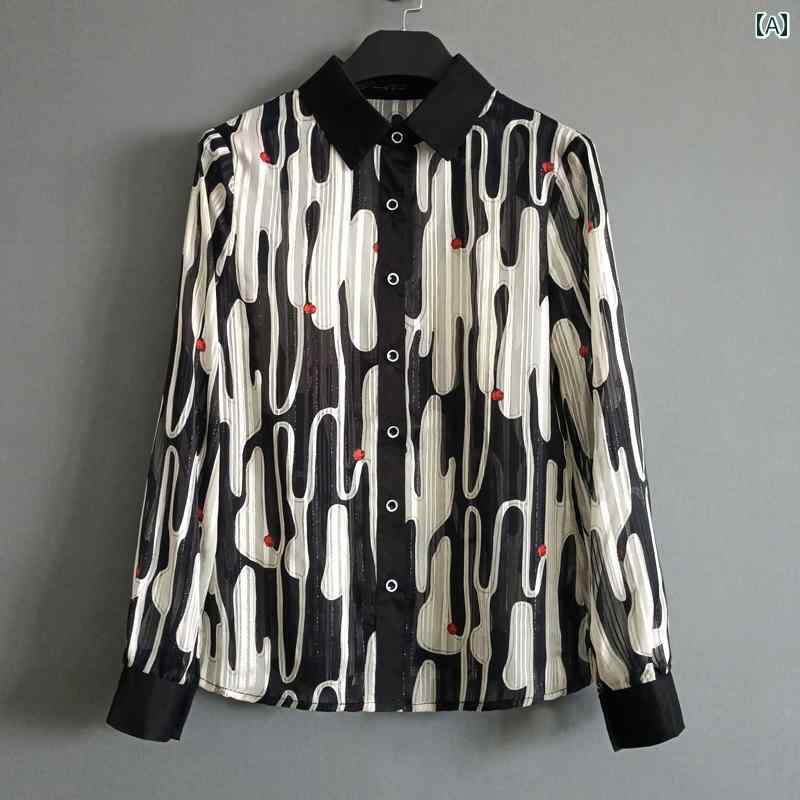 レディース レディース シャツ ブラウス 長袖 春秋 プリント ラウンドストライプ モノクロームに赤のポイント ポロ襟 オーバーシャツ 透け感 ゆったり スタイリッシュ ア..