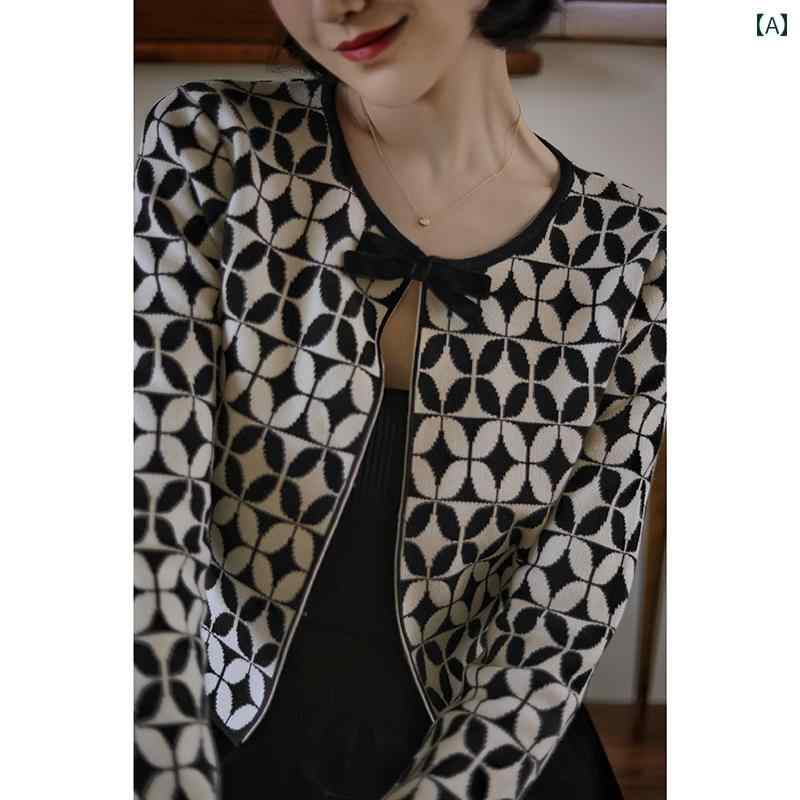 レディース 上着 ショートジャケット ニットカーディガン 長袖 C幾何学 黒白柄 モノクローム ラウンドネック 取り外し可 リボン装飾 エレガント スタイリッシュ フェミニ..