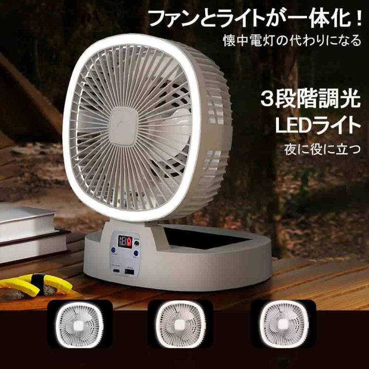 【10000mAh充電池内蔵】大容量10000mAhのリチウムイオンポリマー電池を内蔵しています。フル充電の場合、最小モードで約37時間の連続使用が可能です。卓上はもちろん、砂場など多少置き場が平らでなくても設置可能です。また、【吊り下げて設置可能】吊り下げ用フックが付属しているので、テントなどに吊り下げてアウトドアシーンでも使えます。リビング、キッチンやキャンプなど、どんな場所でも快適に過ごせます。【スマホ充電機能】USB充電口が付いてますのでスマートフォンの充電ができます。緊急時にも便利です。【5枚羽根のなめらかな風&風量3段階調節】ミニリビングファンは5枚羽根が搭載し、空気を細かく分けて肌あたりのいいなめらかな風を送ります。また、風量は3段階の切り替えが可能で、お使いになる場所や暑さに合わせて、お好きな風を自由にお選びいただけます。【3段階切り替えLEDライト】3段階切り替えのLEDライトを搭載しています。風の通..