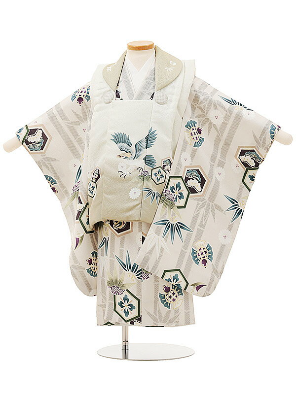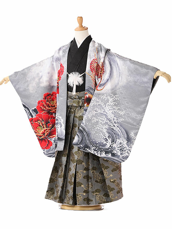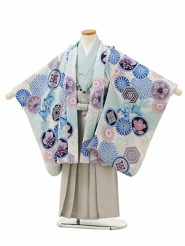 七五三レンタル 男の子 X065オフホワイト菊に獅子xグレー袴 着物 5歳 男の子 レンタル 袴セット 男児 753 5歳男の子 フルセット 子ども きものレンタル 七五三レンタル ..