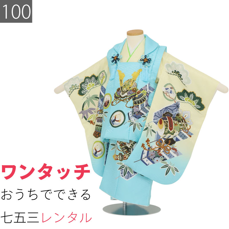 【レンタル】七五三 着物 3歳 男の子 レンタル 簡単 着付け ワンタッチ 100サイズ 被布 白から水色ボカシ 大矢羽根/水色 カブト 753 (6523)