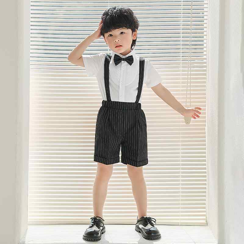 フォーマルスーツ キッズ 男の子 ストライプ柄 ジャケット サロペットパンツ 半袖シャツ 蝶ネクタイ サスペンダー 結婚式 発表会 入学式 卒業式 七五三 誕生日 セレモニ..