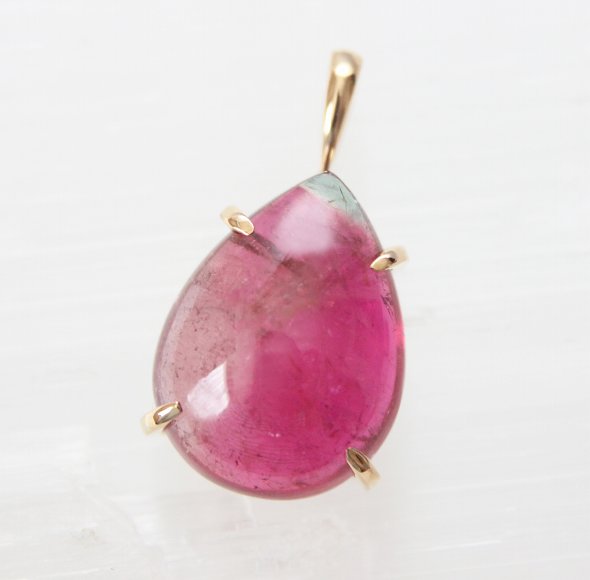 素材 K18(刻印あり) トルマリン 約16×12×6,6ミリ前後 (バチカン含まず) 10,31ct バチカンの内径 約4×2ミリ前後 ブラジル産ピンクトルマリンのペンダントトップです。 全体的に発色の良い濃いピンクですが よく見るとピンク色に濃淡があり 上方にごくわずかなグリーン部分もありますので 厳密にはバイカラートルマリンに分類されます。 細かなインクルージョンはありますが 嫌なものではなく 天然石のトルマリンらしい魅力になります。 ボリューム感のある大粒サイズで 艶やかで飴のようなかわいらしさのあるピンクトルマリンは コーディネートの主役になります。 石自体の美しさを楽しめるようK18の爪留めでシンプルに仕立てられていますので 一生ものとして末永くご愛用いただけます。 こちらは 日本の職人によってルースに合わせて手作業で作られた1点物になります。 ※ こちらはトップのみになりま..