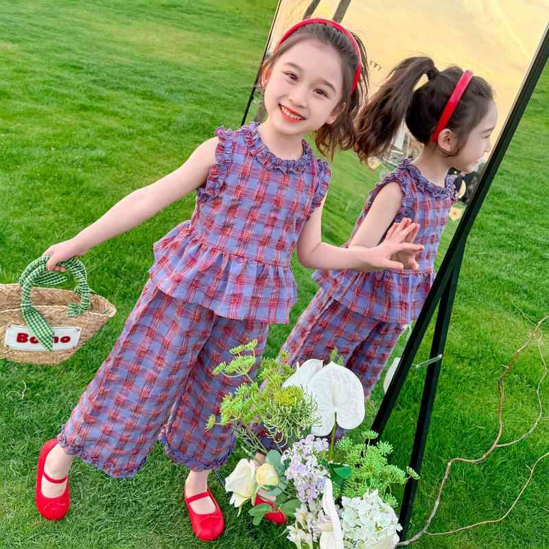 キッズ 女の子 夏 韓国風 チェック柄 フリル襟 ノースリーブ ワイドパンツ セットアップ 綿混 薄手 かわいい 普段使い お出かけ着