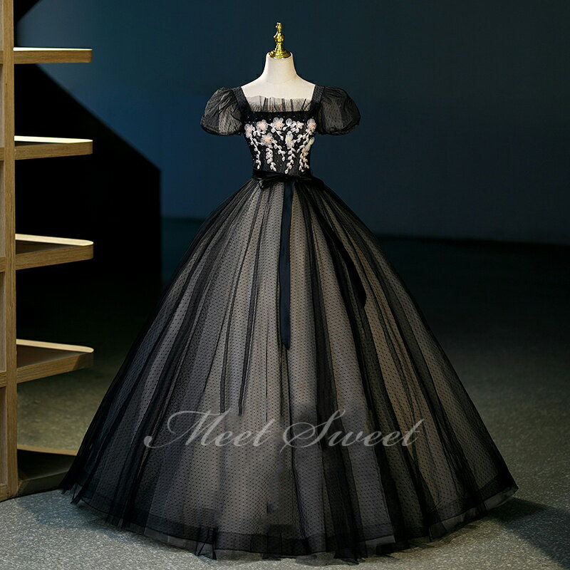 カラードレス ブラック 半袖 演奏会 発表会 二次会 花嫁 ウエディングドレス コンクール 大人 ウェディングドレス プリンセスライン 編み上げ ロングドレス 前撮りドレス..