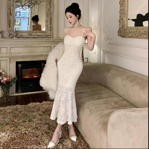 ・素材: 涤纶(聚酯繊維)・柄: 無地・スタイル: 吊带・組合せ形式: 単件・スカート丈: ミドル丈・スカート型: マーメイド・ネックライン: Vネック・袖丈: ノースリーブ・ウエスト: ハイウエスト・流行の要素: フリル、ダイヤモンド・カラー: 米白色・サイズ: S、M、L・スタイル: 通勤・スカート種類: ワンピース・面料成分含量: 80%-90%