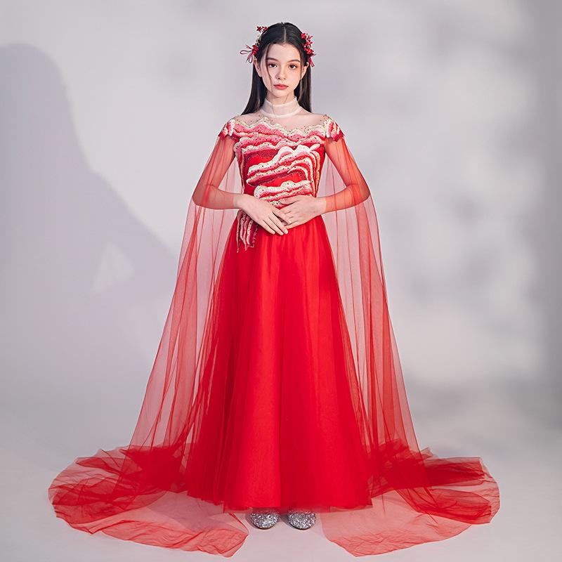 チャイナドレス 女の子 キッズ ジュニア 古筝 発表会 演奏会 コンクール ステージ衣装 レッド 中国風 水墨画柄 千里江山図 伝統柄 フォーマル ロング丈 ポリエステル 華..