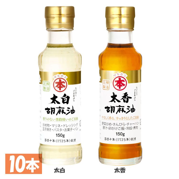 ※リニューアルに伴いパッケージ・内容等予告なく変更する場合がございます。予めご了承ください。【太白胡麻油】香りのない普段使いのごま油胡麻を生のまま搾った普段使いの無香性オイルです。お菓子・パン作りにもおすすめ。【太香胡麻油】やさしく香る、すっきりとしたごま油穏やかな香りとまろやかな味が特徴。和食・日本料理にもおすすめ。●内容量150g●原材料食用ごま油(国内製造)●成分オレイン酸、リノール酸、リグナン類(検索用:胡麻油 ごま油 ゴマ油 太白ゴマ油 太香ゴマ油 太白ごま油 太香ごま油 太白胡麻油 国内製造 高級胡麻油 リグナン類 セサミン FSSC22000 享保10年創業 マルホン 4904688526318 4904688536300) 最強翌日配送対象商品に関するご案内 最強翌日配送対象商品・対象地域に該当する場合は最強翌日配送マークがご注文カゴ近くに表示されます。 最強翌日配送可能なお支払方法は【クレジットカード、代金引換、全額ポイント支払い】..