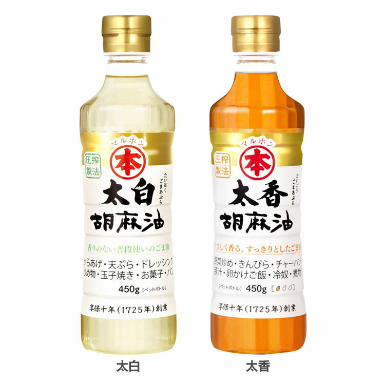 ※リニューアルに伴いパッケージ・内容等予告なく変更する場合がございます。予めご了承ください。【太白胡麻油】香りのない普段使いのごま油胡麻を生のまま搾った普段使いの無香性オイルです。お菓子・パン作りにもおすすめ。【太香胡麻油】やさしく香る、すっきりとしたごま油穏やかな香りとまろやかな味が特徴。和食・日本料理にもおすすめ。●内容量450g●原材料食用ごま油(国内製造)●成分オレイン酸、リノール酸、リグナン類(検索用:胡麻油 ごま油 ゴマ油 太白ゴマ油 太香ゴマ油 太白ごま油 太香ごま油 太白胡麻油 国内製造 高級胡麻油 リグナン類 セサミン FSSC22000 享保10年創業 マルホン 4904688523072 4904688533095) 最強翌日配送対象商品に関するご案内 最強翌日配送対象商品・対象地域に該当する場合は最強翌日配送マークがご注文カゴ近くに表示されます。 最強翌日配送可能なお支払方法は【クレジットカード、代金引換、全額ポイント支払い】..
