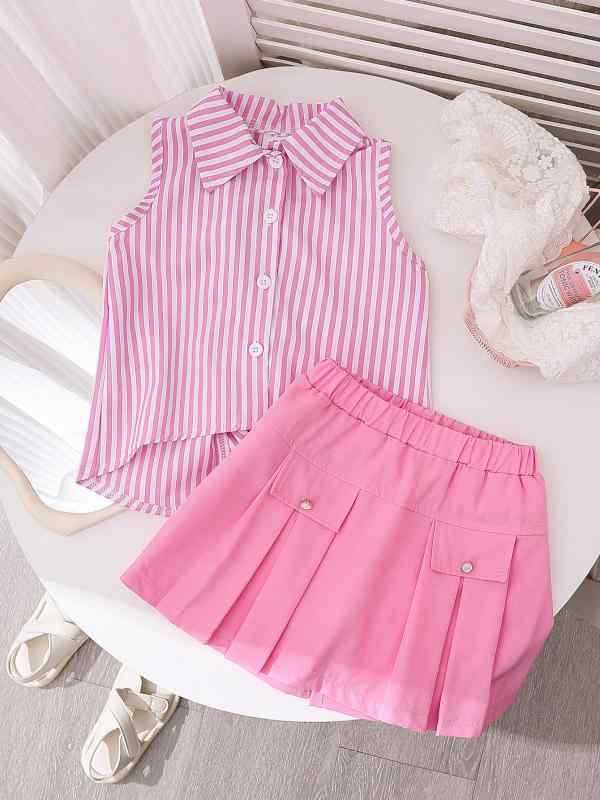 ・性別: 女児・スタイル: カジュアル・セットタイプ: スカートセット・セット数: 2点セット・対象年齢: 8歳以上(140cm以上)・季節: 夏・袖丈: ノースリーブ・フード: なし・厚さ: 普通・パターン: ストライプ、ソリッド・素材: ポリエステル65%・安全基準: Aクラス・閉じ方: シングルボタン・色: ピンク・サイズ: 4Y,5Y,6Y,7Y