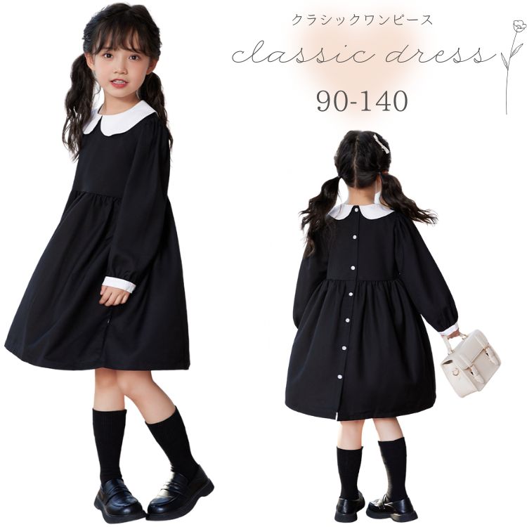 キッズ フォーマル クラシックワンピース ブラック 子供服 膝丈 黒 ラウンドカラー 発表会 入学式 卒業式 記念日フォト 誕生日 演劇 鑑賞 上品 女の子