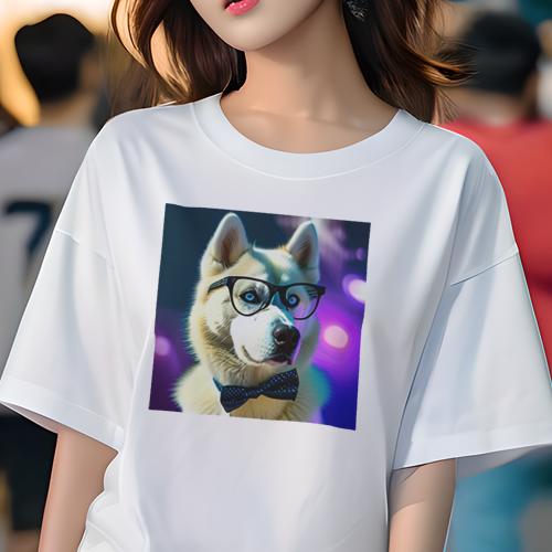 Tシャツ レディース 犬ファン 半袖 春夏 犬柄 プリント カジュアル かわいい 人間用 フィットネス ダンス メガネ シベリアンハスキー 蝶ネクタイ 青い目 紫色の背景 光