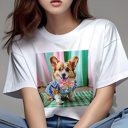 コーギー Tシャツ レディース 犬ファン 半袖 春夏 犬柄 プリント カジュアル かわいい 人間用 個性派 ここだけのデザイン 面白 蝶ネクタイ コーギー チェック柄 カーテン