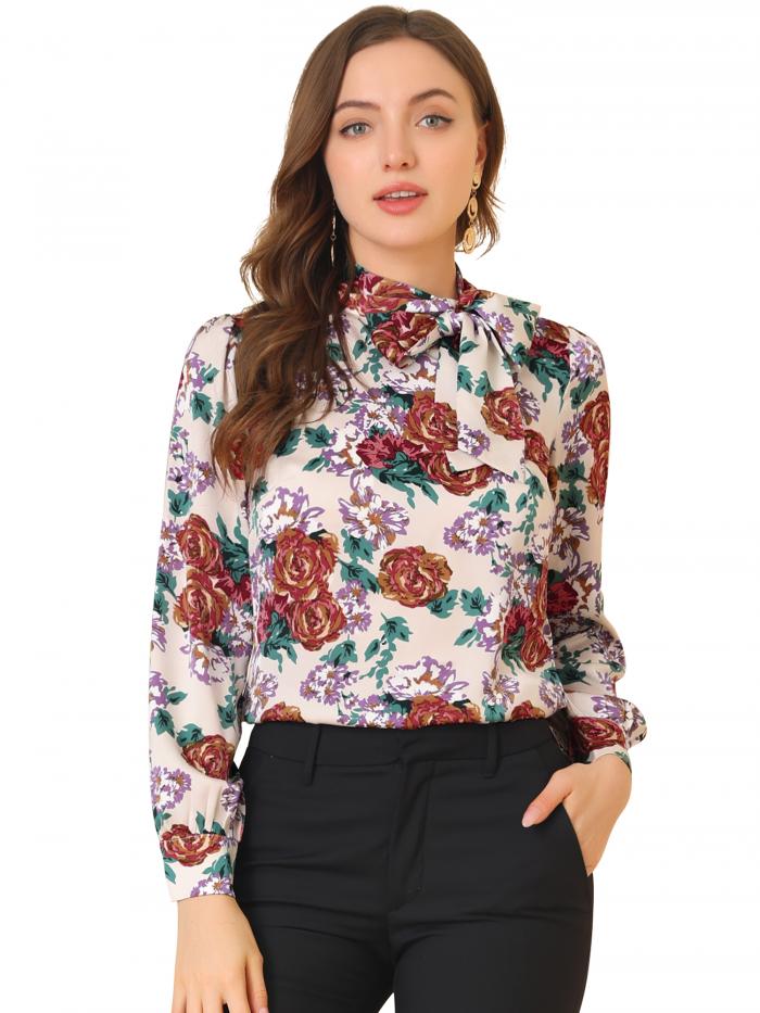 Allegra K 花柄 ボウタイ ブラウス リボン 蝶ネクタイ パフスリーブ 長袖 レディース ベージュ XL