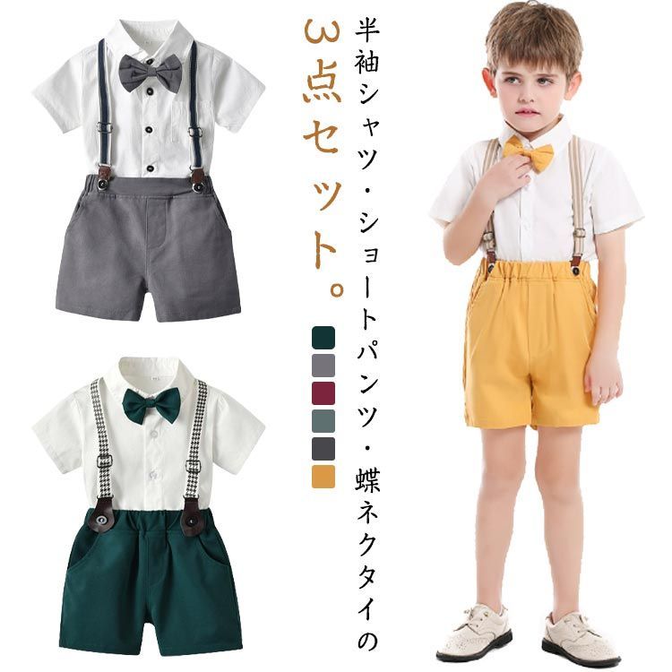 送料無料 子供服 サスペンダー付き 子供スーツセット フォーマル ショートパンツ 3点セット お宮参りおしゃれ 夏 入園式 キッズスーツ 70-130cm スーツ 半袖 結婚式 男の子 タキシード 入学式 誕生日 シャツ 蝶ネクタイ 卒業式 1歳 セットアップ 半袖