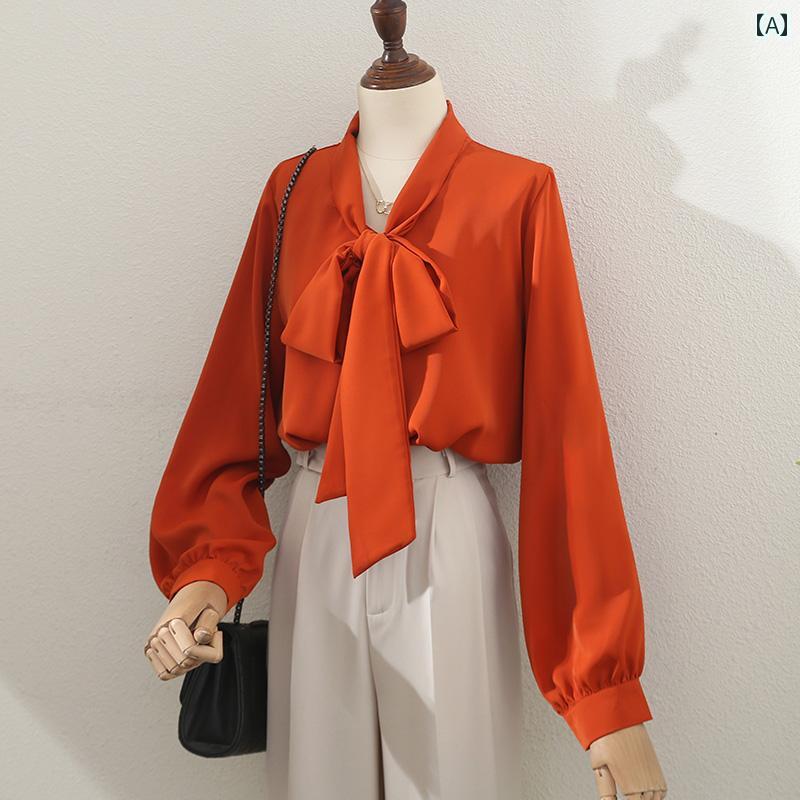 レディース ブラウス ボウタイ おしゃれ 春夏 オレンジ 蝶ネクタイ Vネック ドレープ シフォンシャツ レディース ランタンス リーブ シック リボントップス