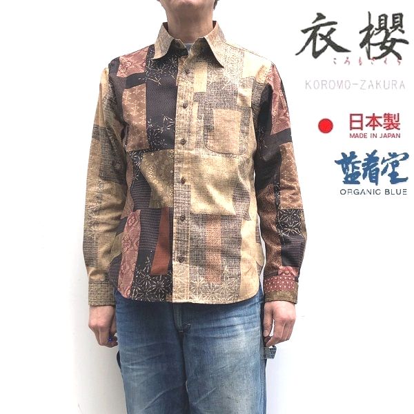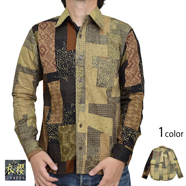 表裏一体切替レギュラー長袖シャツ「大島紬調パッチワークプリント」 衣櫻 SA-1416 和柄 和風 日本製 国産
