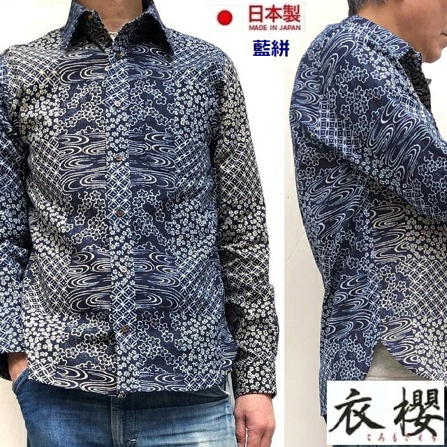 衣櫻 ころもざくら 表裏一体 長袖 シャツ 藍絣 桜流水 七宝柄 藍色抜染 純国産 日本製送料無料 ギフト♪ あす楽 ポイントUp 長袖コーディ