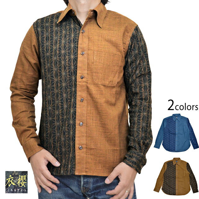 表裏一体切替レギュラー長袖シャツ「縞麻ノ葉」◆衣櫻KSK-M08602Detail味わい深い物作りをされている衣櫻さんから、表裏一体切替レギュラー長袖シャツ「縞麻ノ葉」(SA-1417)のご紹介です。人気の表裏一体シリーズより新柄が登場しました!生地の表と裏を切替風に配置した、アシンメトリーデザイン。今回は古典柄である縞麻ノ葉柄です。ボディーには、ムラ糸クロス生地を採用。ややしっかりとした素材感が特徴です。裾は中央の長い背中センタープリーツ仕様。左胸にはポケットが縫い付けられています。ボタンにはウミガメ柄の鼈甲ボタンです。こちらの製品は、一枚ずつ全て色柄出しが異なっており、同じものは世界に二つと存在しません。1枚で着るのはもちろん、ジャケットやカーディガンのインナーとして着用するも良し、Tシャツやタンクトップの上からさらりと前開きで羽織るも良し。お気に入りの着こなしを是非発見して下さい♪ブランド衣櫻(ころもさくら)..