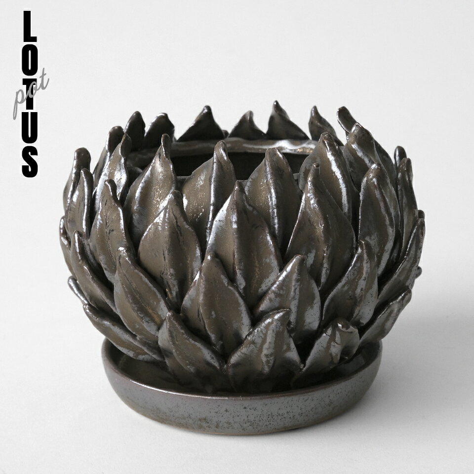 LOTUS POT【ブロンズ 】Φ14cm×H11cm 陶器 植木鉢 4号 ロータス BRONZE 個性的 受け皿付き おしゃれ かっこいい 独特 アロイド アガベ 塊根 アロエ 葉っぱ 室内 蓮 ビンテ..