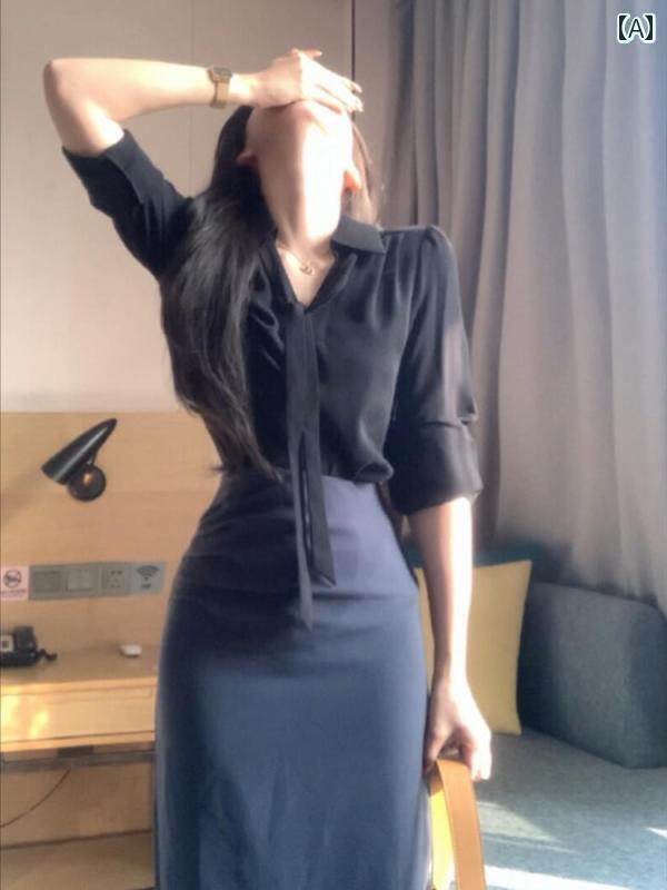 Yシャツ 無地 シンプル 黒の 高級 フレンチ シャツ レディース タイ 長袖 ボトムトップ 2025 春 Vネック インナーウェア