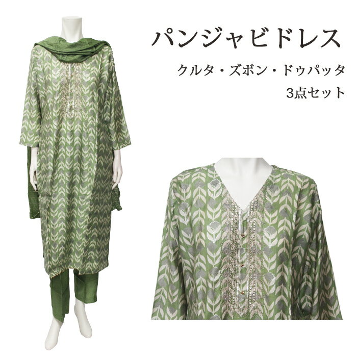 <L>パンジャビドレス:クルタ・ズボン グリーン系 / インド衣装 民族衣装 アジアン ファッション パンジャビ ドレス カミーズ エスニック