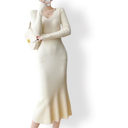 アイカ ica 柔らか リブニット素材 ミモレ丈 長袖 Vネック マーメイドワンピース (WT)