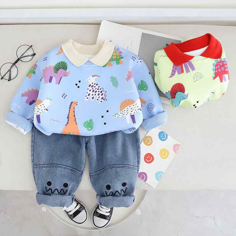男の子 キッズ ベビー 春秋 長袖 柔らかい 綿 プルオーバー ポロシャツ 総柄 恐竜 かわいい おしゃれ カジュアル 普段着 2点セット