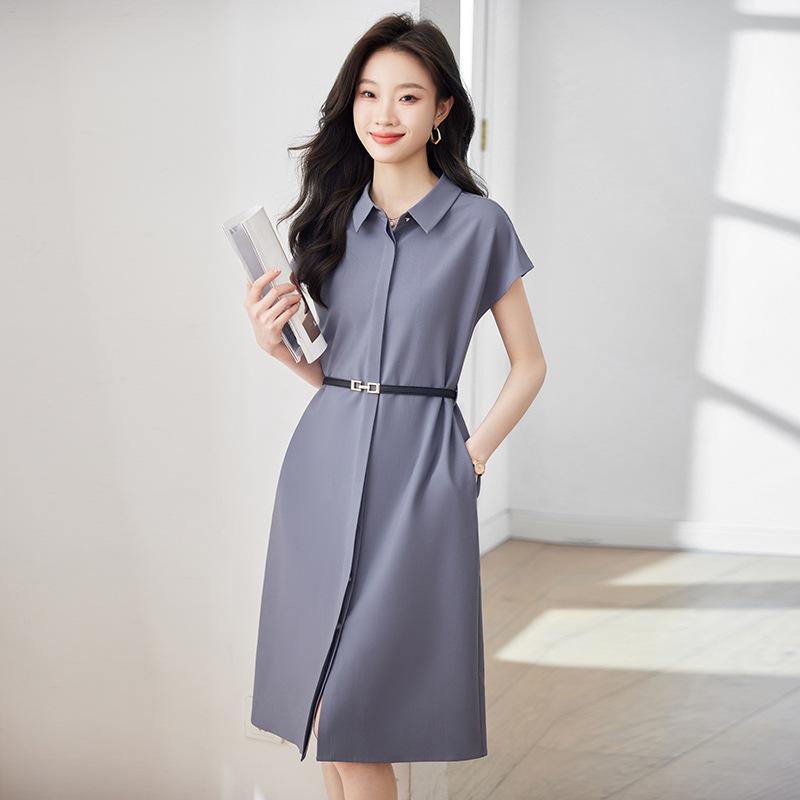 ・カテゴリ: ワンピース・スタイル: 上品エレガント・主な素材: ポリエステル70-80%、スパンデックス30%以下・柄: 無地・加工: ノンアイロン加工・ネックライン: 襟付き・袖丈: 半袖・袖タイプ: レギュラー・スカート丈: ミディ丈・スカートタイプ: Aライン・ウエスト: ミッドライズ・デザイン特徴: プリーツ・カラー展開: オリーブイエロー、ブラック、グレー、ライトブルー、ダークブルー、ワインレッド・サイズ展開: S、M、L、XL