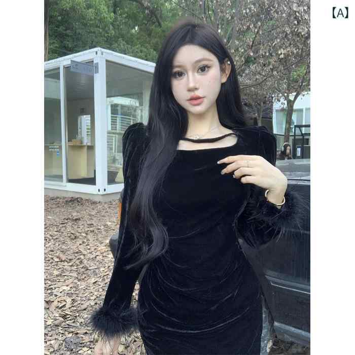 ワンピース レディース 秋冬 黒 ブラック フレンチ ベルベット ベロア 高級感 上品 エレガント ウエストシェイプ スクエアネック インナー タイト ロング丈