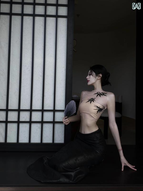 レディース トップス かわいい チャイナ風 竹 プリント 伸縮性 透明 メッシュベスト ショート トップ ノースリーブ 女性