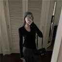 ニット レディース 秋冬 トップス 韓国風 長袖 Vネック スリム 無地 リブニット プルオーバー カットソー 普段使い インナー ブラック 黒