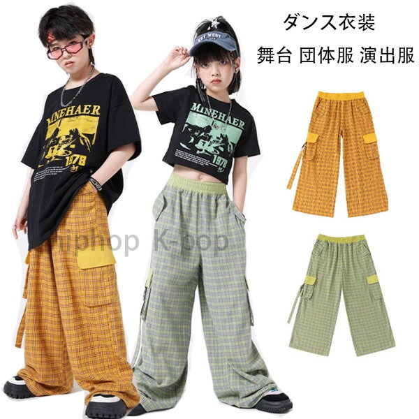 ダンスパンツ チェック柄パンツ イエロー グリーン 長ズボン、ロングパンツ 男女兼用 キッズ ダンスパンツ 女の子 男の子 舞台 団体服 演出服 ワイドパンツ 韓国 新作 人..
