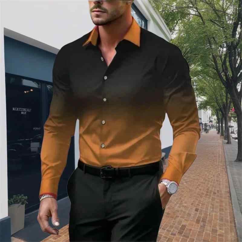シャツ メンズ グラデーションカラー デジタルプリント カジュアル スリム 長袖 翻襟 ポリエステル混紡 春秋