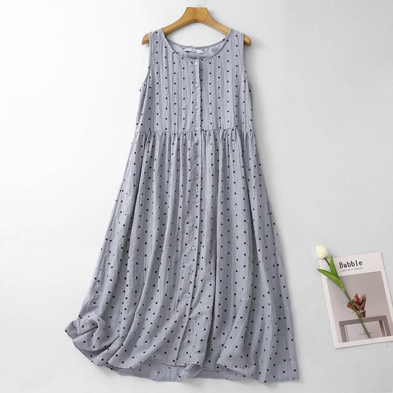 ワンピース レディース フレンチスタイル ラウンドネック ドット柄 ノースリーブ Aライン キャミワンピース 上品 若見え 細見え 体型カバー ゆったり ミディ丈 ポケット..