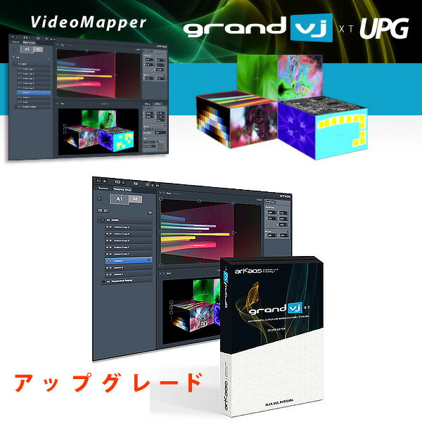 GrandVJ 2 XT UPGは一つの出力に複数の出力を可能にする「VideoMapperモジュール」を搭載したGrandVJの拡張プラグインです。※ 本パッケージをご利用いただくにはGrandVJ 2が必要です※ GrandVJ Ver1をお持ちの方は2への無償バージョンアップが可能です※ 両方お持ちで無い方はGrandVJ 2 XTをご購入ください話題のプロジェクションマッピングを可能にする追加モジュールです。一つの画面出力に複数の出力「サーフェス」を作り、サイズ、コンテンツ、解像度が異なる複数の素材を同時にコントロール。 各レイヤー及びセルを別々に「サーフェス」へ出力して、立体物に向けた高度な映像表現を実現します。大規模な3Dモデル上でのマッピング構築や特殊な機材を必要とせず、コンピュータとプロジェクタだけで簡単にプロジェクションマッピングが可能になります。