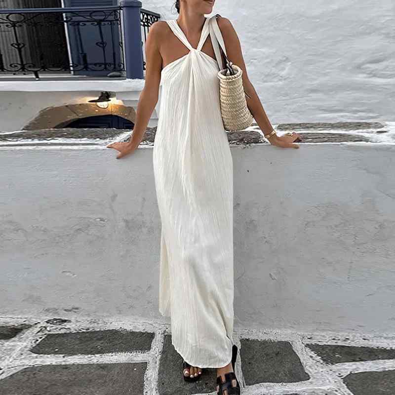 ファッション 服 オシャレ カワイイ シンプル 大カワイイ サイズ 婦服 ワンピース インディペンデント カジュアル ブレンド テクスチャーファブリック ホルターネック ロング ドレス