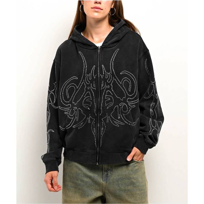 Insomnia Visuals 【 Sigil Rhinestone Black Zip Hoodie Women's Charcoal 】 黒色 ブラック フーディー パーカー レディースファッション トップス パーカー レデ..