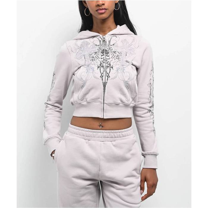 Insomnia Visuals 【 Double Cross Rhinestone Grey Crop Zip Hoodie Women's Grey 】 灰色 グレー Crop クロップ フーディー パーカー レディースファッション ト..