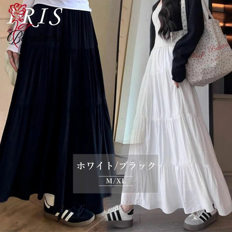 スカート ティアードスカート ボトムス レディース 無地 ロング丈マキシ丈スカート ウエストゴム ファッション 上品 きれいめ 大人 着痩せ 春服 秋服 カジュアル 白 黒 フレア Aライン ふんわり 薄手 裏地あり 春夏 お洒落