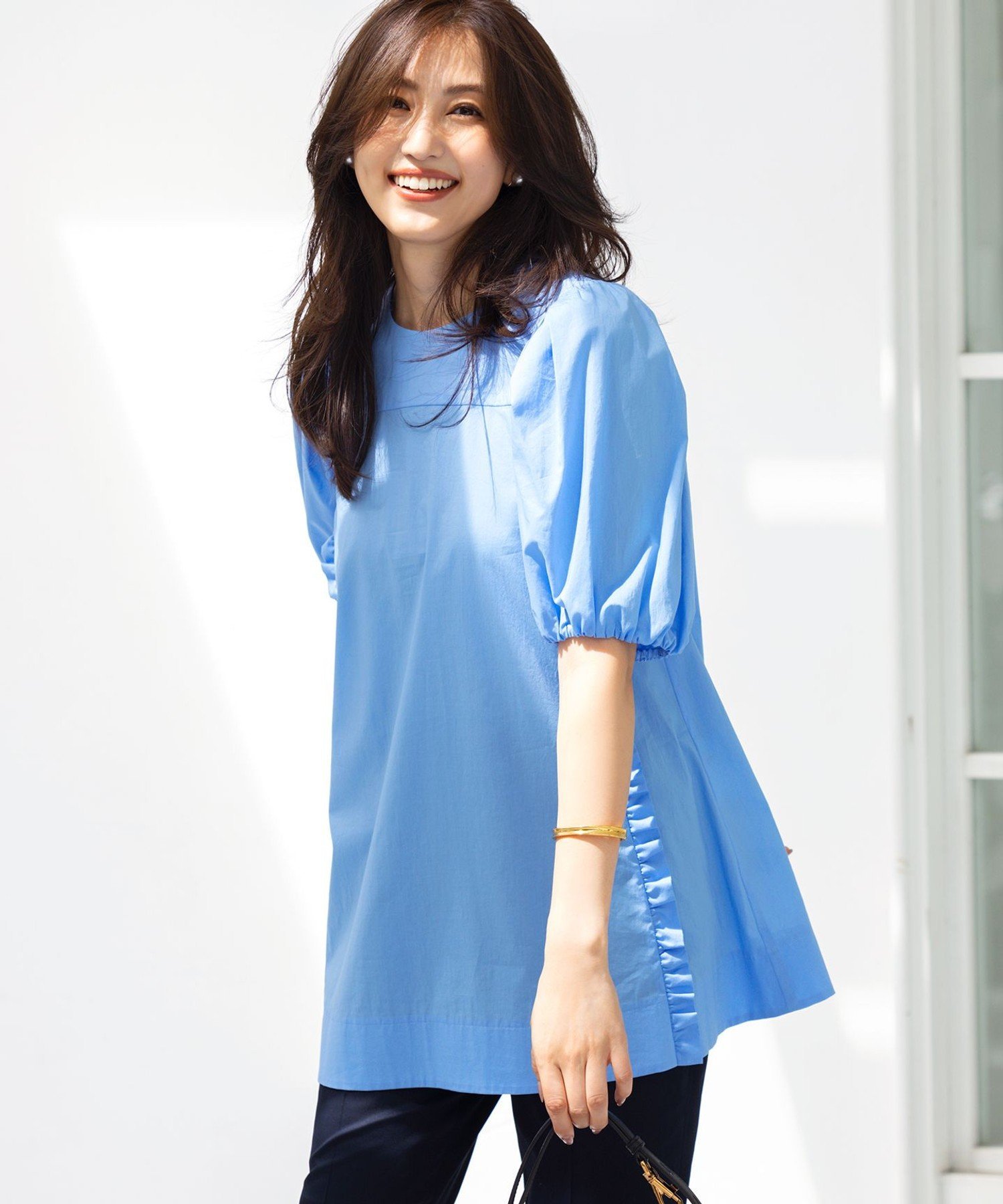 組曲(クミキョク)コットンローン ボリュームスリーブブラウス清涼感ある素材と大胆なボリュームスリーブが華やかな一枚映えブラウス■デザイン胸元の切り替えですっきりとみせながら、裾にかけて広がるAラインシルエットは気になるおなか周りやおしりをカバーしながら大人の可愛らしさを演出してくれます。サイドは、切り替えフリルを施すことで、こなれ感と今どき感をプラスしています。1枚でさらっとサマになり、きれいめアイテムでスタイリングしても、デニムなどあえてボーイッシュなアイテムでスタイリングしても、どちらのスタイルも素敵です。■素材ナチュラルな表面感とやわらかな光沢感、色にも深みが出て質感のあるさらっとした生地に仕上げています。夏の日差しに溶け込むこなれ感を出しながら、程よいきれいめ感と清涼感のある爽やかな着心地が嬉しい素材です。※画像はサンプルを使用しているため、実際にお届けする商品と色味やサイズ等の仕様に..