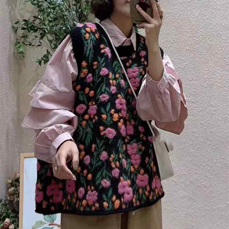 ニットベスト レディース 韓国 レイヤード 重ね着 ゆったり 大きめサイズ 配色 春秋 ミルキーベージュ コーヒーブラウン ブラック グリーン ピンク系 アクリル